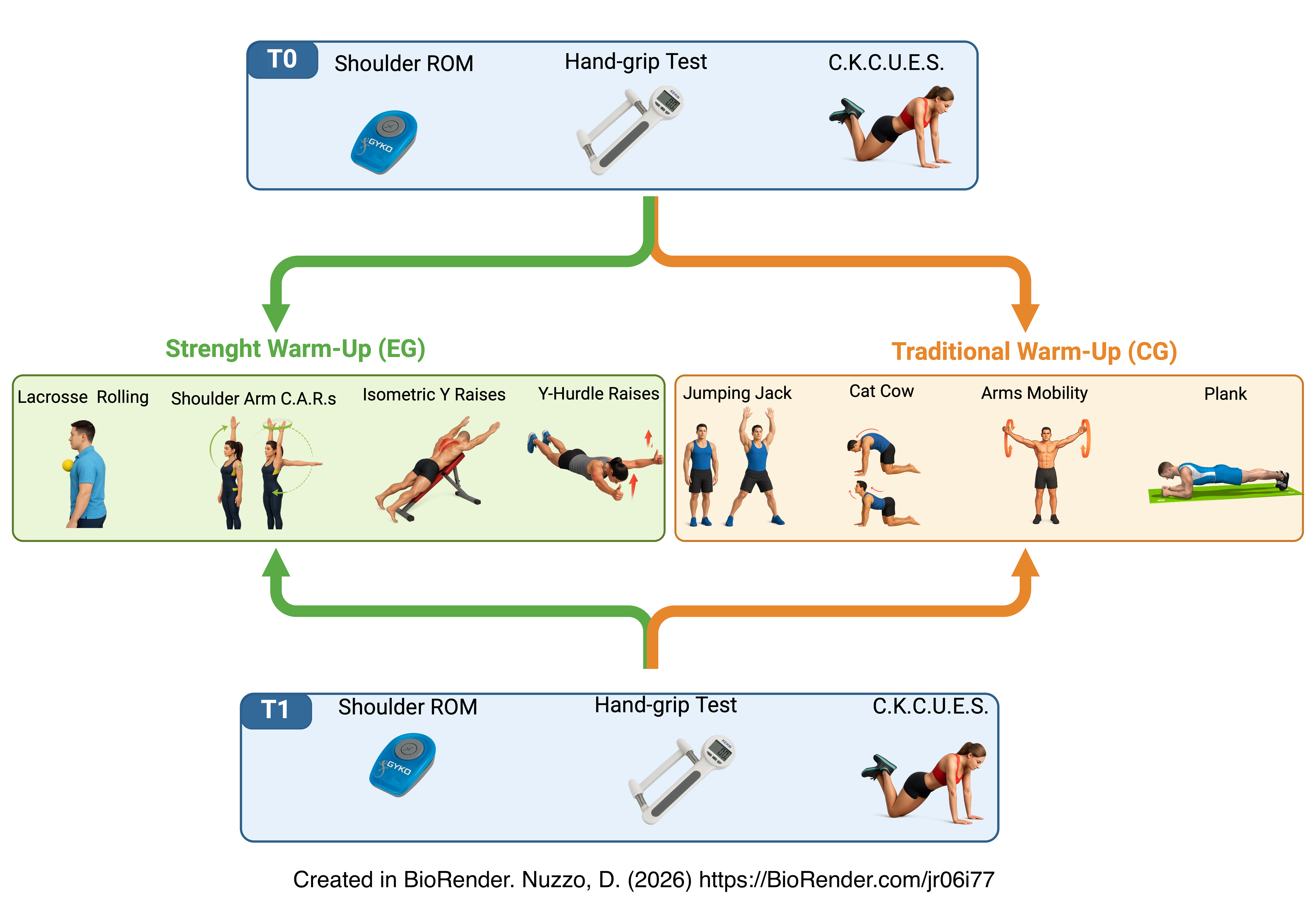 Overhead sports place high demands on the shoulder complex, making warm-up specificity relevant for acute readiness. This randomized controlled pilot trial compared the immediate effects of a shoulder-specific warm-up with a habitual routine in 24 youth competitive overhead athletes (14–20 years), allocated to an experimental group (EG = 12) and a standard warm-up group (SWG = 12). Outcome measures were collected before and immediately after warm-up and included shoulder flexion range of motion (ROM), handgrip strength, Closed Kinetic Chain Upper Extremity Stability (CKCUES) performance, and post-warm-up Rating of Perceived Exertion (RPE; Borg CR-10). A significant group-by-time interaction was found for right shoulder flexion ROM (p = 0.003, η²p = 0.346), with a significant increase in the EG from baseline to post-test (p = 0.008). No significant effects were observed for left shoulder flexion ROM, handgrip strength, or CKCUES performance. Post-warm-up RPE was significantly higher in the EG than in the SWG (p = 0.041). These preliminary findings support the practical value of more targeted warm-up strategies in overhead sports, while larger longitudinal studies are needed to confirm their broader functional relevance.