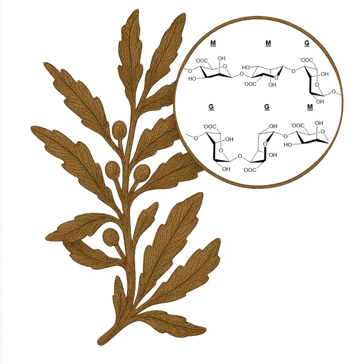 Alginate is a natural anionic polysaccharide located in the cell walls of brown algae and is composed of β-D-mannuronic acid (M) and α-L-guluronic acid (G) units linked by β-(1,4) glycosidic bonds (Figure 1) [18,19]. Mannuronic acid adopts a 4C1 chair conformation, while guluronic acid adopts a 1C4 conformation, both in pyranose form [20,21]. These monomers are distributed along the polymer chain in homopolymeric (MM, GG) and heteropolymeric (MG) blocks, whose relative abundance and sequence distribution critically determine the physicochemical properties of alginate [22,23,24,25]. In particular, the gelling properties of alginate are highly sensitive to guluronic acid content, since consecutive G residues form cooperative binding sites for divalent cations such as Ca2+ according to the “egg-box” model [26,27,28]. As a result, alginate composition and block distribution strongly influence gel stiffness, elasticity, and stability, which are key parameters for many technological applications [20,24,25,29]. Importantly, these structural features are not fixed, but depend on several factors, including algal species, growth conditions, geographic origin, and processing history [16,21,29].