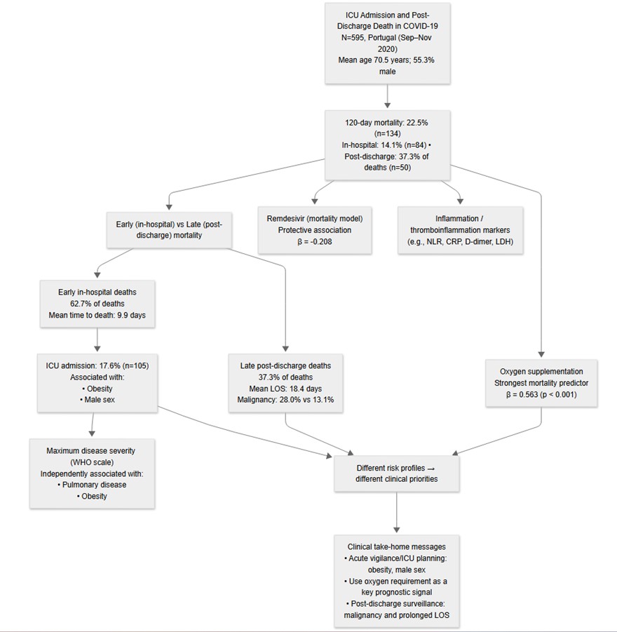 - Santos, M.M.S.; Pereira, I.J.; Cuboia, N.; et al. Predictors of early and long-term mortality after ICU discharge in critically ill COVID-19 patients: A prospective cohort study. PLOS ONE 2023, 18, e0293883. [Google Scholar] [CrossRef]