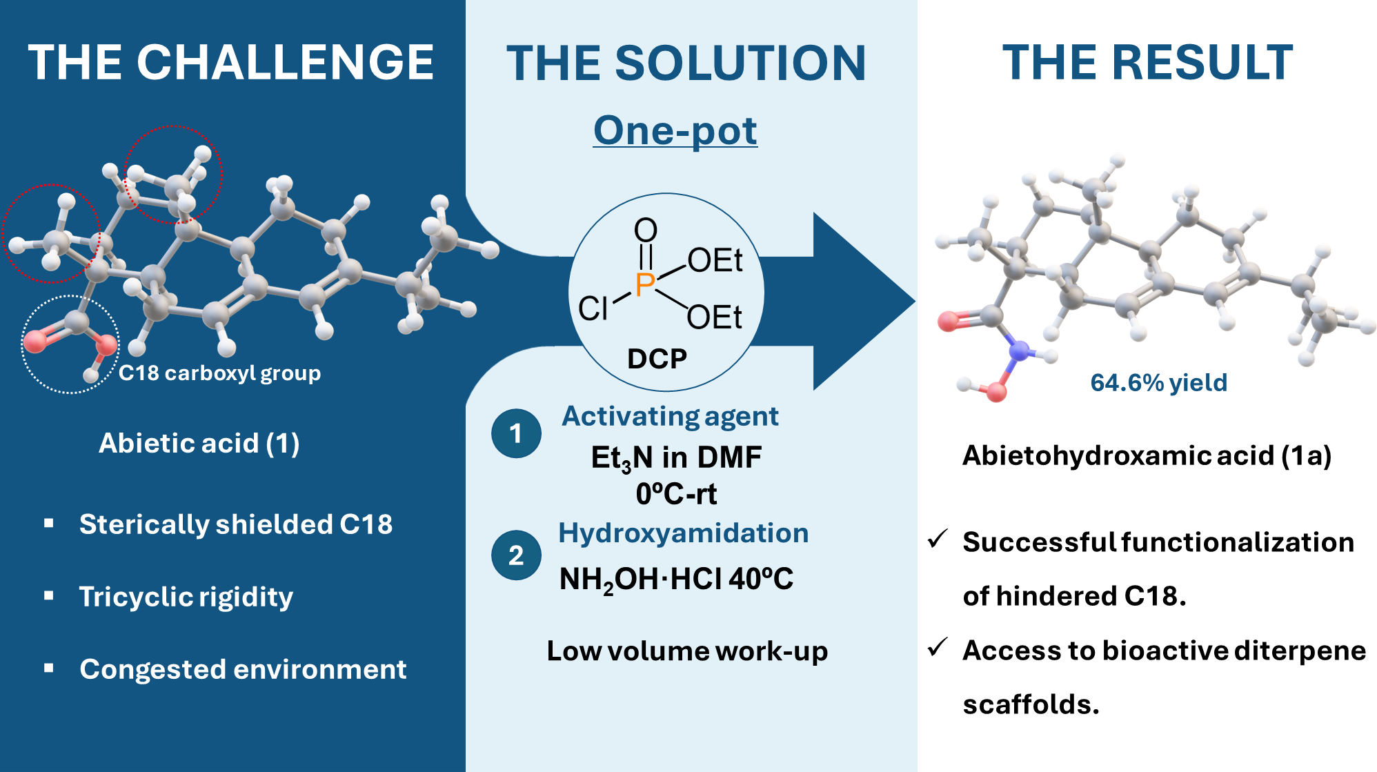We have developed a robust and efficient single-vessel protocol for the synthesis of abietane-type hydroxamic acids. This methodology successfully overcomes the extreme steric hindrance associated with the C18 carboxyl group. The use of diethyl chlorophosphate (DCP) as an activating agent proved superior to traditional strategies, as it facilitates the formation of reactive diethyl phosphate mixed anhydride intermediates. These species were successfully isolated and characterized, providing direct experimental evidence of the activation pathway.