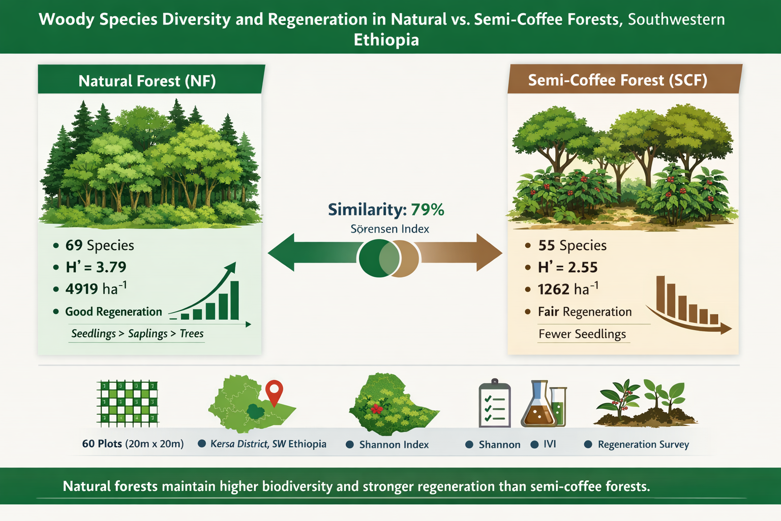 Tropical forests in southwestern Ethiopia are increasingly shaped by land-use systems that integrate biodiversity conservation with agricultural production, particularly semi-coffee forest management. This study compared woody species diversity, composition, forest structure, and regeneration status between natural forest and adjacent semi-coffee forest in Kersa District, Jimma Zone. A systematic stratified sampling design using 60 plots (20 m × 20 m) was employed. Vegetation data were analyzed using the Shannon–Wiener diversity index, species richness, Sørensen similarity index, Importance Value Index (IVI), and regeneration status. A total of 75 woody species from 45 families were recorded, with 69 species in natural forest and 55 in semi-coffee forest. Floristic similarity was high (0.79), but natural forest retained more unique species (29%) than semi-coffee forest (10.9%). Shannon diversity was higher in natural forest (3.79) than semi-coffee forest (2.55), though not statistically significant. Stem density was significantly greater in natural forest. Regeneration was good in natural forest and fair in semi-coffee forest, with significantly higher seedling and sapling densities. Overall, semi-coffee forests maintain species similarity but show reduced structural complexity and regeneration potential due to management practices.