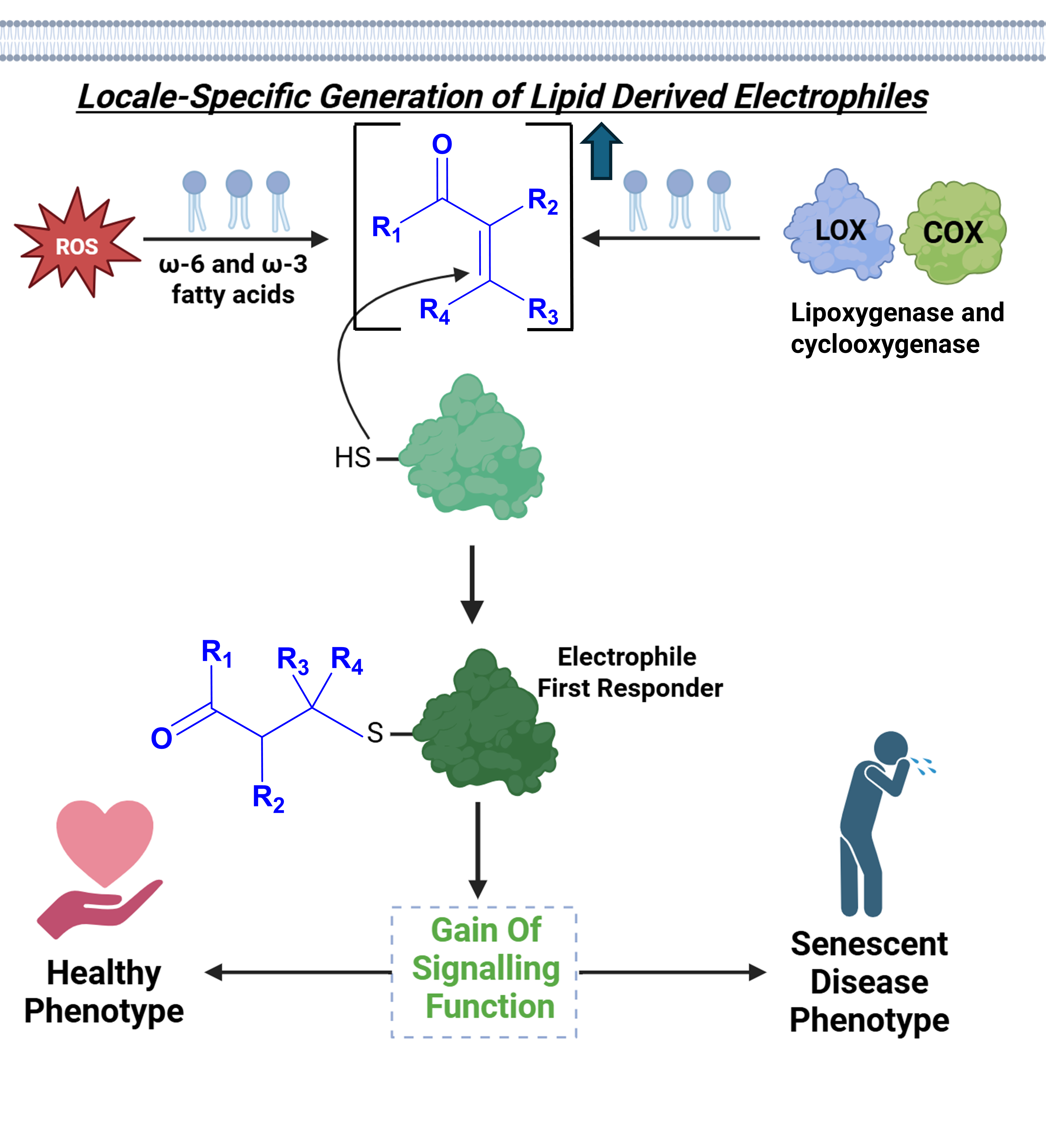 Cellular stress signaling conveys vital messages to the cell’s machinery to respond dynamically to internal and external environmental cues. One prevailing hypothesis for such signaling is to bring about crucial downstream functional changes in the cell’s ability to withstand intra- and extra-cellular stress, as exemplified by the NRF2-ARE pathway. Reactive electrophilic metabolites (REMs) are often generated from membrane lipids or respiratory metabolites in inflammatory and stress signaling contexts. REMs harbour an innate ability to irreversibly bind protein-cysteines, and form DNA and RNA adducts. Our work has led us to propose a new hypothesis regarding the role of locale-specific REM build-up in stress signalling; whereby they can label both the majority stable protein residents in a given locale, as well as minority guests transiently existing within a subcellular compartment, at a kinetically significant rate to trigger a “gain of function” signalling cascade. Much like the NRF2 signalling pathway, such downstream signalling messages could assist the cell’s ability to survive against microenvironment-specific stress and adapt on-demand. As REMs accumulate in several disease-specific cells, especially age-related disorders such as cancer and neurodegeneration, understanding the functional signal propagation mechanisms shaped by specific REMs engaging with specific biomolecular targets will prove vital for future therapeutic interventions with enhanced precision and context.