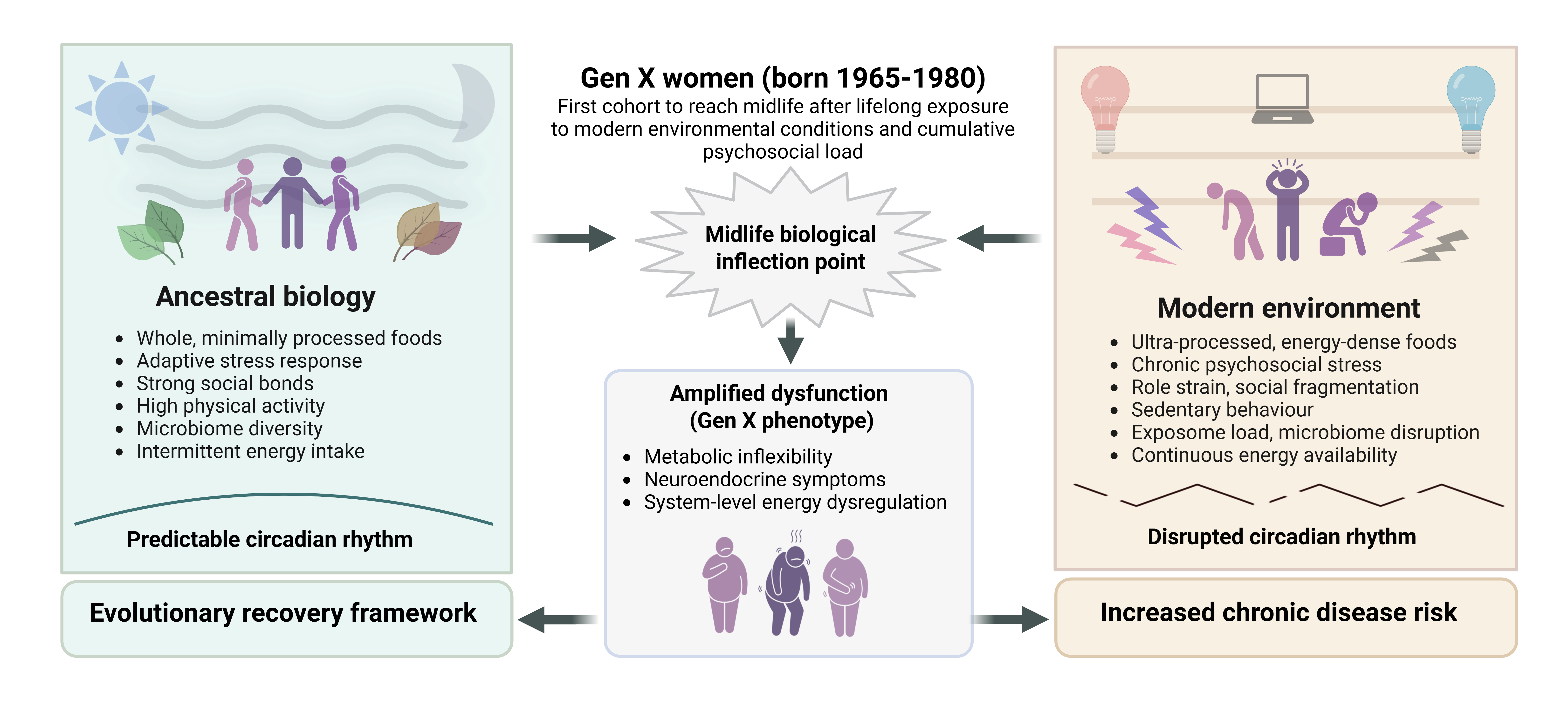 Chronic stress, circadian disruption, sedentary behavior, industrialized diets and disturbances in the gut microbiome have created an evolutionary mismatch between ancestral physiology and the modern environment. Generation X (Gen X) women (born between 1965–1980) are the first cohort to enter midlife having lived their entire adult lives within these conditions while also carrying distinct cohort-specific factors shaped by major economic and cultural transitions. The interaction of evolutionary mismatch and Gen X pressures destabilizes hormonal regulation, increases allostatic load and impairs mitochondrial function, contributing to fatigue, metabolic inflexibility and cognitive dysfunction during perimenopause and menopause, with implications for postmenopausal health and long-term disease risk. Women with polycystic ovary syndrome have reduced insulin sensitivity and a heightened proinflammatory response that makes them more susceptible to Gen X evolutionary mismatch pressures. This paper synthesizes evidence from evolutionary biology, endocrinology, neuroscience and lifestyle medicine to present an integrated model explaining the mechanisms driving midlife symptomatology in Gen X women. The model places midlife dysfunction within an evolutionary mismatch context, where modern environmental exposures and cohort-specific demands interact with hormonal, immune and metabolic changes to drive convergent pathophysiological mechanisms. A tiered recovery framework is proposed, targeting allostatic load reduction, circadian realignment, restoration of metabolic flexibility, and integration of mitochondrial, musculoskeletal and gut–brain–endocrine signaling systems.