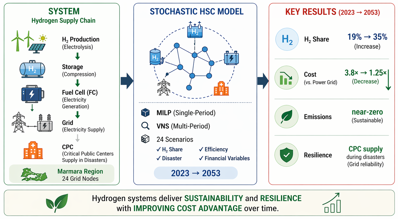 Hydrogen (H2) is regarded as a promising option for sustainable energy systems; however, its large-scale use in electricity supply remains limited. This study develops a stochastic network optimization model to examine the applicability of H2-based electricity generation. The proposed Hydrogen Supply Chain (HSC) model evaluates cost and emission performance under uncertainty by considering disaster conditions, transmission losses, depreciation, and the time value of money. The Marmara Region of Türkiye is divided into 24 grid nodes, and a single-period model for 2023 is solved using Mixed-Integer Linear Programming (MILP). The HSC is allowed to meet 10–40% of electricity demand and to replace collapsed grid lines by supplying critical public centers (CPCs) during disasters. The results show that the HSC can meet about 25% of demand, although at costs higher than power grid (PG) electricity, while keeping emissions near zero. The model is then extended to a multi-period structure (2023–2053) and solved by Variable Neighborhood Search (VNS). Over time, H2 costs decline, and its share rises from 19% to 35%. These findings suggest that H2 can support long-term sustainability, resilience, and energy security.