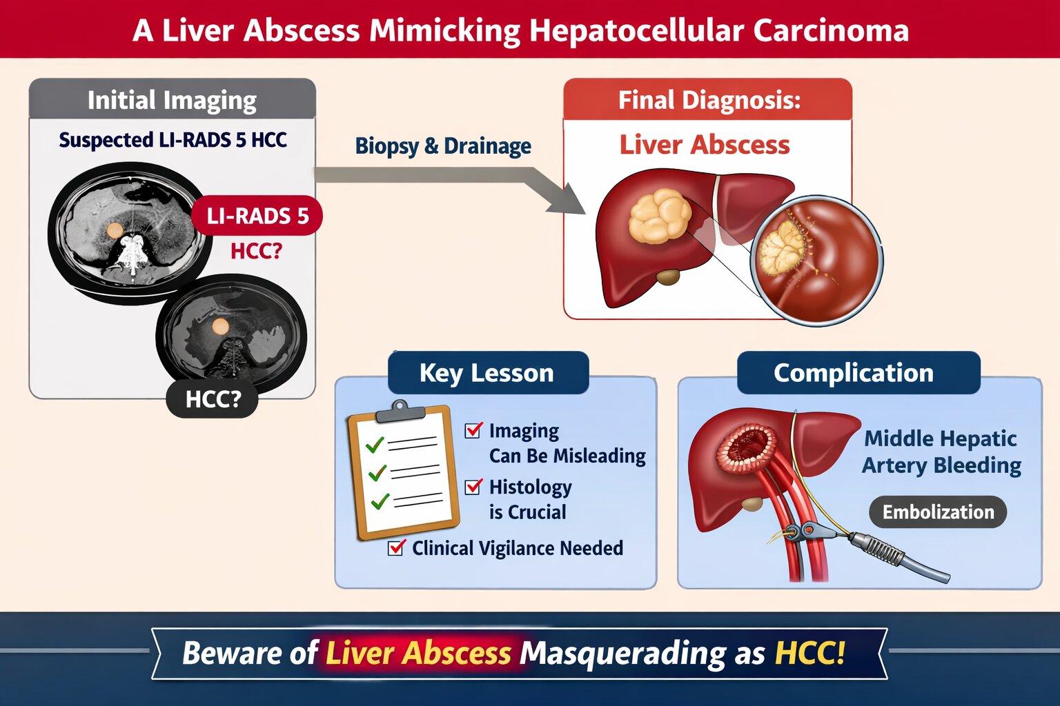 Background: Liver abscesses represent an atypical yet potentially life-threatening complication of bacterial, fungal, protozoal, and helminthic infections. Frequently, the clinical findings associated with liver abscesses are nonspecific, necessitating a reliance on imaging for diagnosis. It is uncommon for a liver abscess to radiographically resemble a malignant liver tumor such as hepatocellular carcinoma (HCC). Here, we present the case of a 45-year-old male who was initially diagnosed with HCC (BCLC C) but was subse-quently found to have a liver abscess following biopsy.