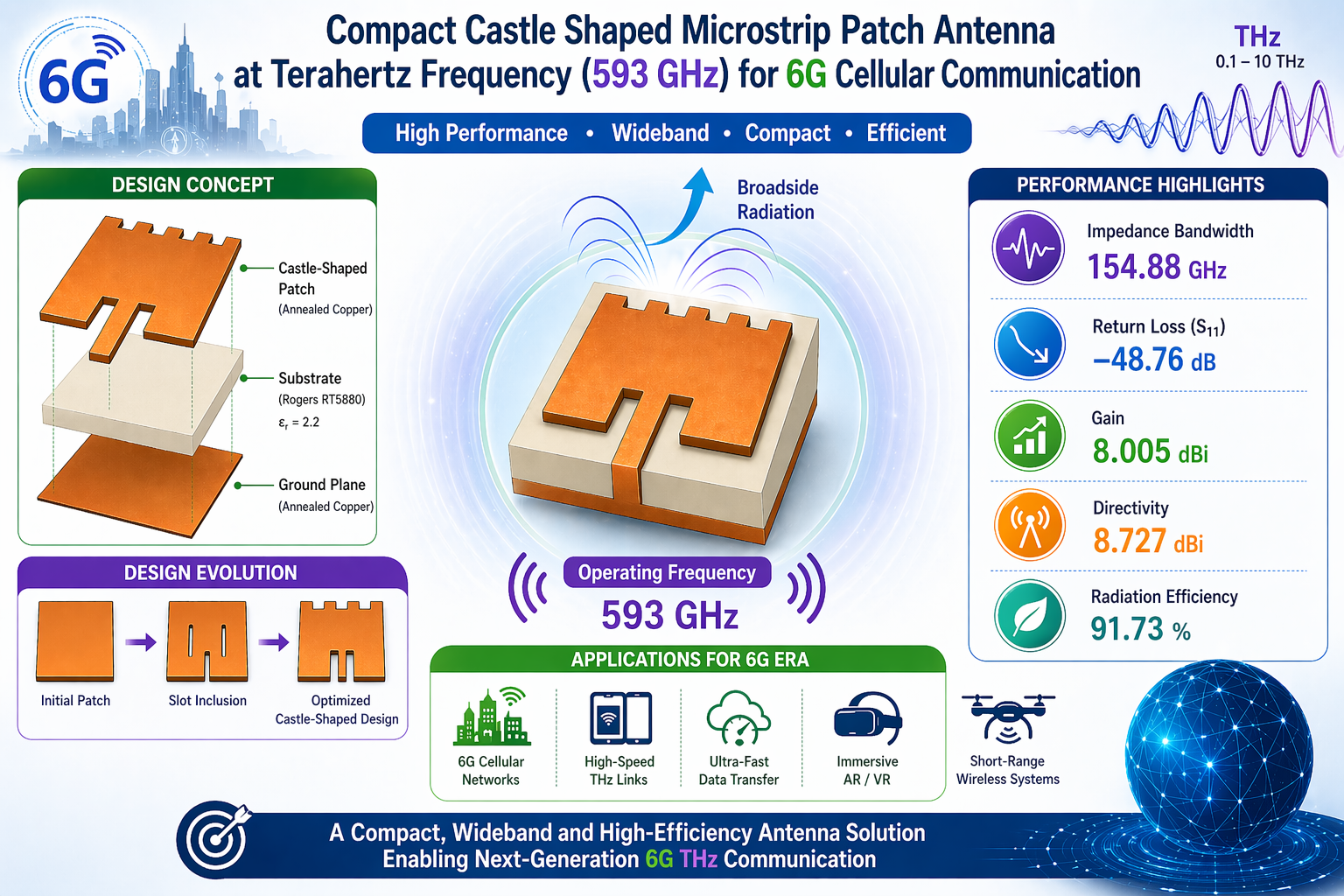 The fast growth of wireless communication systems and the growing need for very high data rates have been the driving force behind the creation of sixth-generation (6G) technologies that operate in the terahertz (THz) frequency region. This research represents the design and analysis of a small compact microstrip patch antenna that works in the terahertz (THz) frequency range for 6G cellular connectivity. The Rogers RT5880 substrate and annealed copper are used in the design of the suggested antenna, which aims for a 593 GHz resonance frequency. A progressive design technique that incorporates slotting and geometric optimization has been used to develop a castle shaped antenna which improve impedance matching and bandwidth to overcome the inherent constraints of traditional microstrip antennas. Excellent impedance matching is shown by the final design's near-ideal voltage standing wave ratio (VSWR) and return loss (S11) of –48.76 dB. It achieves a broad impedance bandwidth of 154.88 GHz, which far outperforms many current systems. The antenna exhibits consistent radiation characteristics in the broadside direction, a gain of 8.005 dBi, a directivity of 8.727 dBi, and an efficiency of around 91.73%. The proposed design performs very well in terms of bandwidth and efficiency, while also preserving compact dimensions and structural simplicity, as shown by a comparative comparison with most current literature. These results validate the suitability of the proposed antenna for high-speed, short-range THz communication systems in future 6G networks.