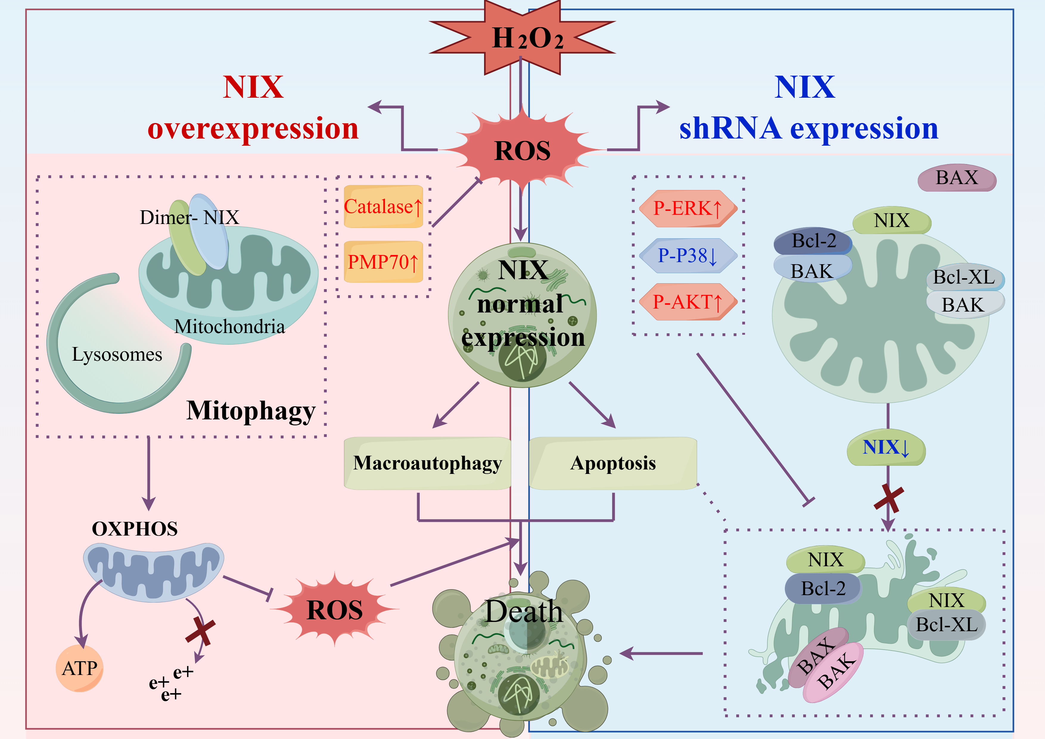 Oxidative stress is a major contributor to neuronal apoptosis and subsequent neurofunctional deficits. This study investigates the dual role of the mitochondrial membrane-anchored protein NIX in PC12 cells, a model for mature neurons. We demonstrate that both overexpression and knockdown of NIX attenuate apoptosis under oxidative stress, albeit through distinct mechanisms. Overexpression of NIX promotes cell survival by activating NIX-mediated mitophagy, which clears damaged mitochondria and intracellular reactive oxygen species (ROS), thereby maintaining redox homeostasis. Conversely, knockdown of NIX reduces apoptosis primarily by diminishing the intrinsic pro-apoptotic function of the protein. Collectively, these findings reveal that NIX expression levels critically gate PC12 cell fate under oxidative stress by differentially activating pro-survival or anti-apoptotic pathways.