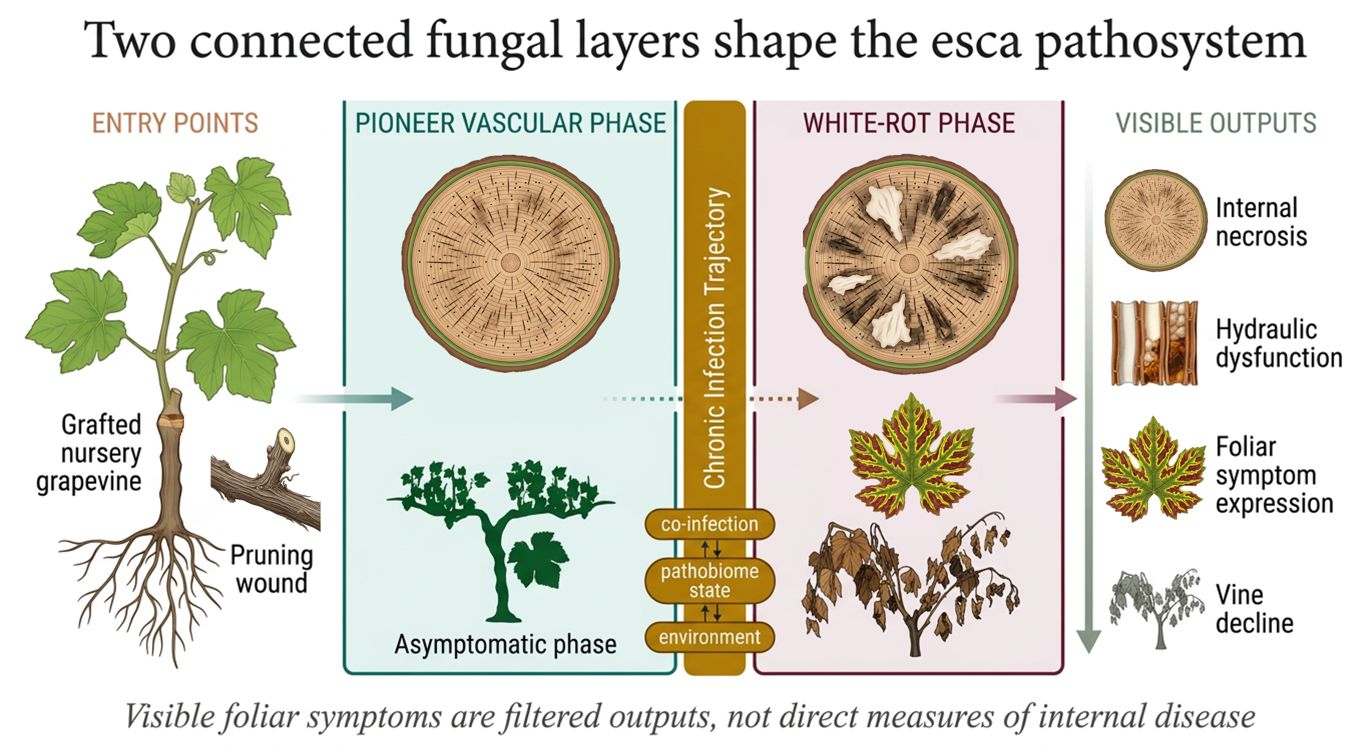 Esca remains one of the most conceptually challenging disease syndromes of grapevine because it cannot be reduced to a single pathogen, lesion type or external phenotype. Foliar symptoms are erratic, internal wood damage is heterogeneous, and fungi associated with the syndrome may persist in asymptomatic vines. Much of this difficulty stems from treating esca-associated fungi as functionally equivalent, even though they occupy different niches and contribute differently to disease development. Here, we revisit grapevine esca through a fungal-biology-centred framework focused on Phaeomoniella chlamydospora, Phaeoacremonium minimumand white-rot basidiomycetes, especially Fomitiporia mediterranea. We argue that the esca pathosystem is best understood as the interaction between two biologically connected but non-equivalent fungal layers: a pioneer vascular phase and a later white-rot phase. Within this perspective, Petri disease and esca proper are interpreted as stages along a continuous host-fungus trajectory shaped by colonization strategy, tissue occupation, decay biology and pathobiome context. This distinction clarifies why host phenotypes are so difficult to interpret. Current evidence supports partially independent layers of host response, including resistance to pioneer colonization, tolerance to hydraulic dysfunction, resistance to wood decay and resilience under chronic infection. We therefore propose that “esca resistance” should be interpreted not as a unitary host trait, but as a multidimensional consequence of fungal functional differentiation, host physiology and environmental modulation.