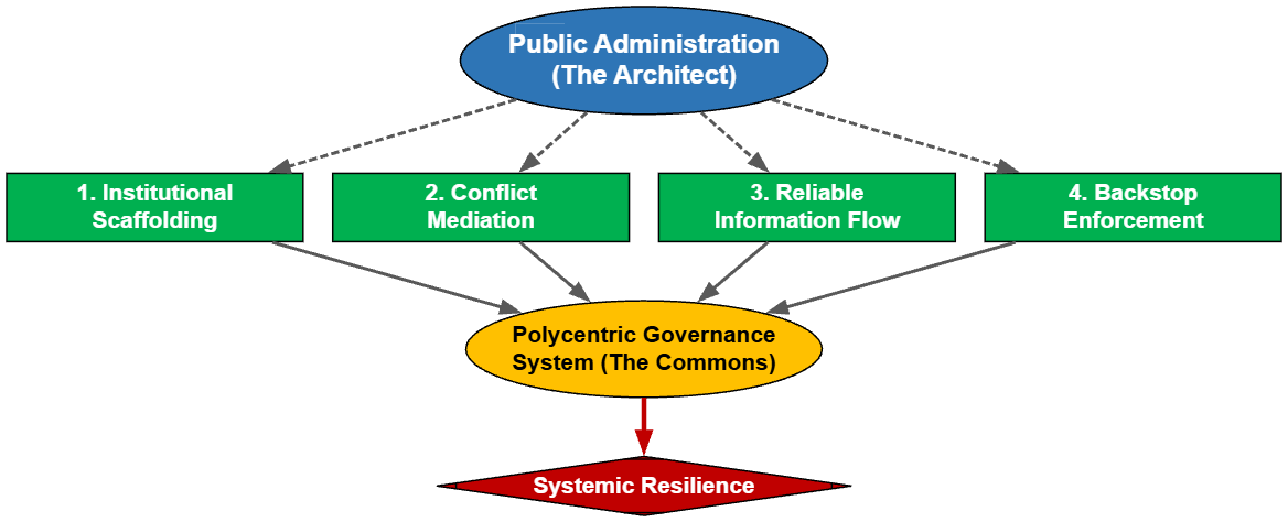 This systematic literature review examines the long-standing problem of the tragedy of the commons within the field of public administration. Through a synthetic evaluation of institutional diagnostic and organizational analysis tools, this study deconstructs the traditional dichotomy between centralized state control and local self-governance. The findings reveal a critical interpretive gap: the lack of a coherent theoretical framework for the active, architectural role of the state. To fill this gap, the article develops a synthetic conceptual framework that redefines public administration not as a direct manager or an absent observer, but as an architect of multilevel, polycentric governance systems. This role involves providing institutional support, ensuring access to reliable information, managing cross-scale linkages, and guaranteeing conflict resolution. This approach shifts the focus from a search for a single solution toward the design of resilient institutional ecologies.