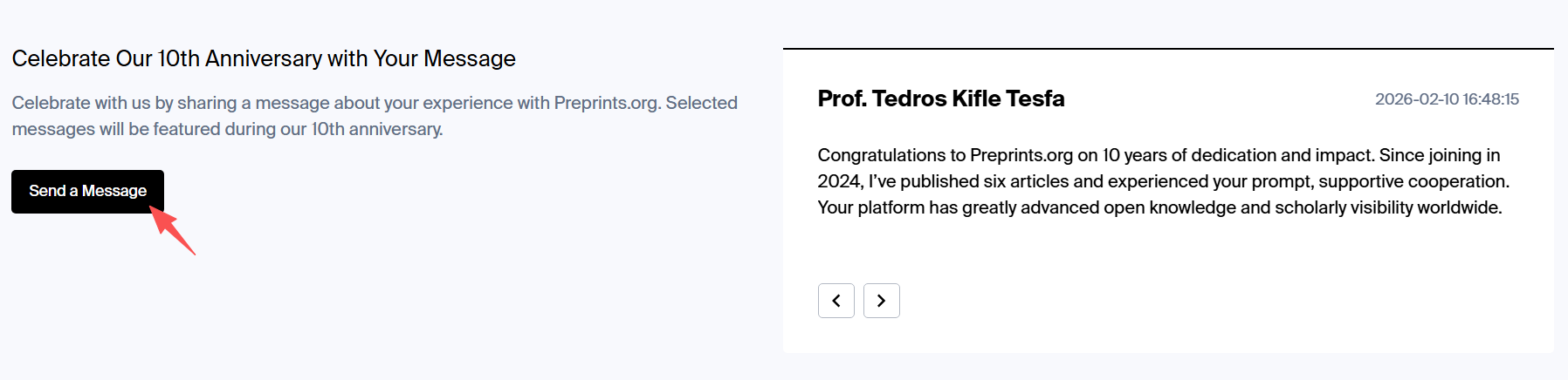 At the same time, we would like to invite our broader community to take part. We encourage you to visit the Preprints.org 10th Anniversary page and leave your anniversary message, whether it’s a few words of support, a reflection, or a wish for the future. Your voice is an important part of this milestone. Selected messages will be featured during our 10th anniversary.